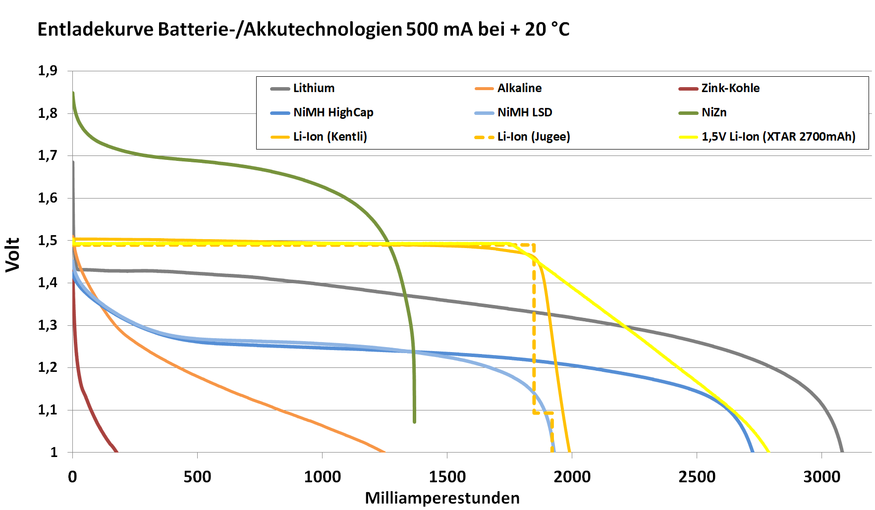 Spannung (Nennwert)1,5 V konstant (geregelt aus 3,7 V Zelle)1,2 V typisch eher 1,3 V1,5 V1,7 V anfangs, 1,5 V typisch